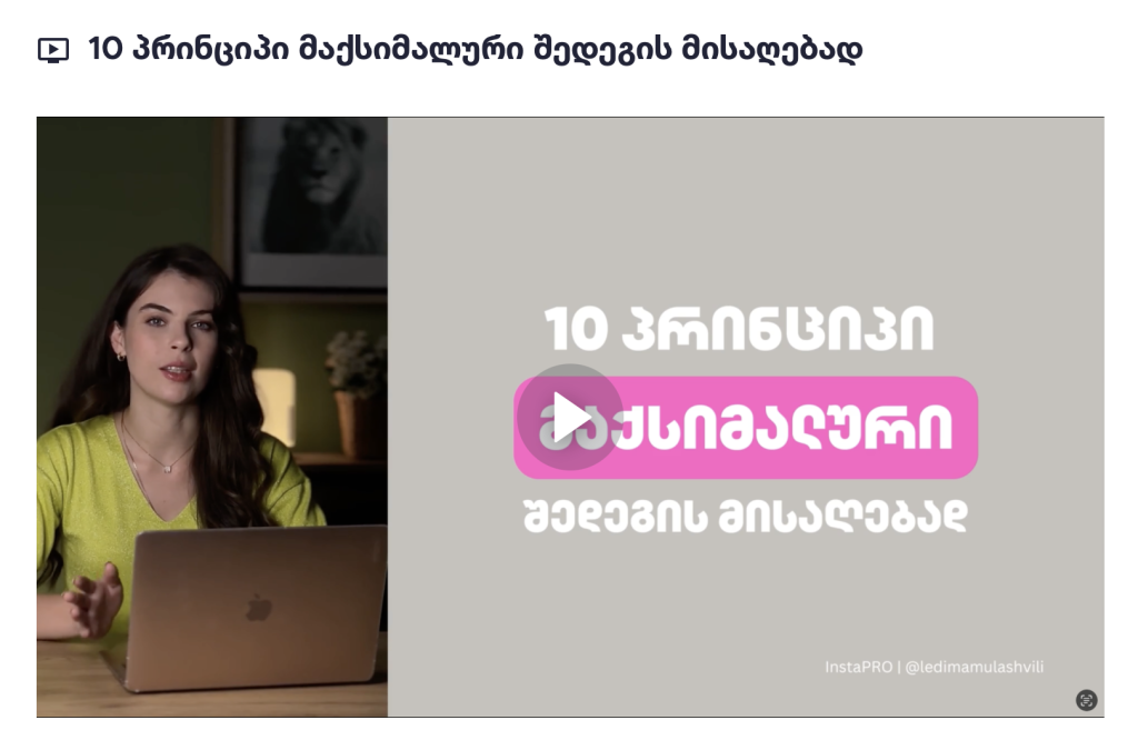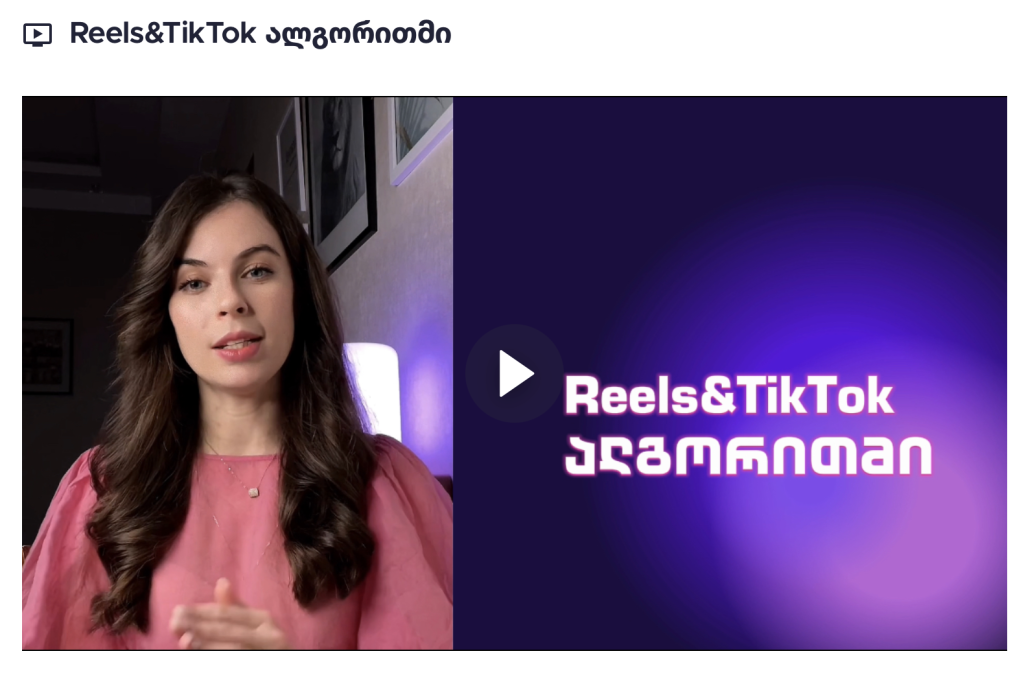 პროგრამა შედგება წინასწარ ჩაწერილი და დამონტაჟებული ვიდეო-ლექციებისგან, რაც სწავლის პროცესს ხდის ძალიან კომფორტულს და ეფექტურს, რადგან შეგიძლიათ უყუროთ ნებისმიერ დროს. ინფორმაცია არის სტრუქტურირებული, ლაკონური, გასაგებად შეფუთული, პრეზენტაციით და მაგალითებით.