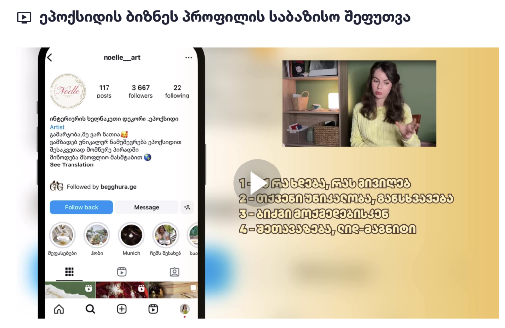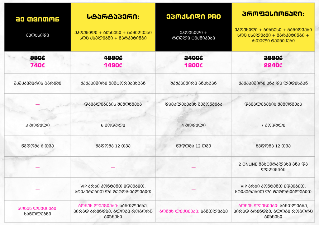 წარმოგიდგენთ კოლობორაციით შექმნილ უნიკალურ კურსს, რომელიც გაძლევთ შესაძლებლობას 1,5 თვეში მიიღოთ ჩვენი მრავალწლიანი გამოცდილება ეპოქსიდის სფეროში, მარკეტინგში, საკუთარი ბიზნესების მართვაში და შეისწავლოთ მასშტაბირების ყველაზე თანამედროვე და ეფექტური ინსტრუმენტები